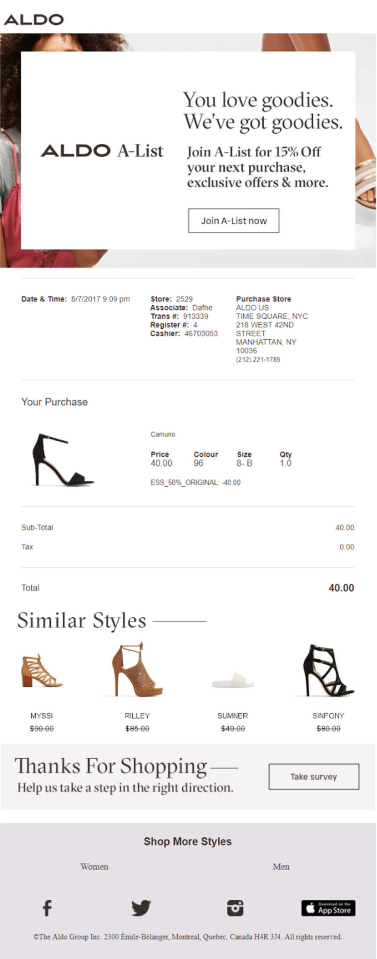 ALDO Shoes leveraged the capabilities provided by flexEngage to meet their in-store ereceipt adoption goals. They leveraged flexEngage to drive six-figure sales directly from their ereceipts.